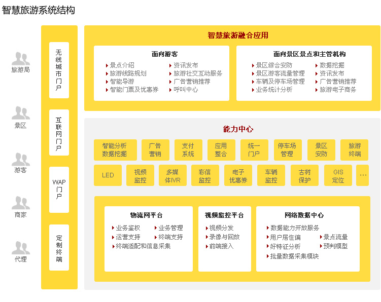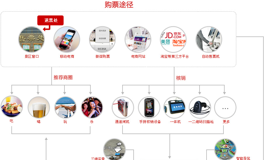 智慧旅游是通過“三網(wǎng)”融合的方式,把傳統(tǒng)景區(qū)快速提升到不但支持傳統(tǒng)的紙質(zhì)票銷售與管理,同時(shí)還支持電子商務(wù)、B2B+B2C的電子票平臺、移動營銷、微信營銷、微信賣票、景區(qū)智能導(dǎo)覽、分享到朋友圈、大數(shù)據(jù)分析、代理管理等完整且系統(tǒng)化的智慧景區(qū),有了此系統(tǒng)后,您可以快速實(shí)現(xiàn)在淘寶、天貓等電商賣電子票,擁有景區(qū)的形象宣傳網(wǎng)站、B2B+B2C的電子票平臺,擁有微信售票、微營銷、移動營銷、景區(qū)導(dǎo)覽、分享到朋友圈等移動互聯(lián)網(wǎng)下的所有功能。