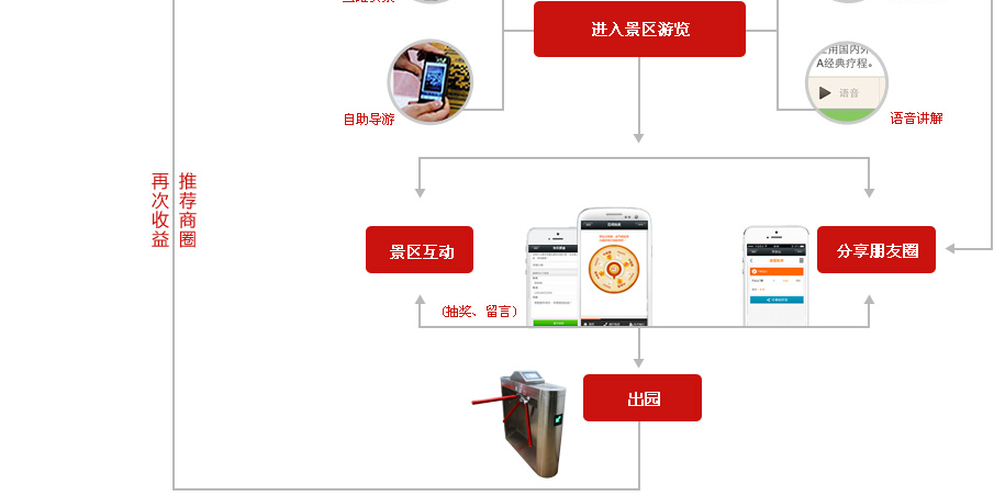 移動營銷+微營銷+景區(qū)導(dǎo)覽,通過吸引用戶主動掃碼(或關(guān)注)的方式,使景區(qū)宣傳更加立體,游客亦可全方位了解景區(qū),包含產(chǎn)品管理,景點(diǎn)介紹,景區(qū)導(dǎo)覽,景區(qū)線路等景區(qū)里的吃、游、玩完整介紹,另通過抽獎、大轉(zhuǎn)盤、問卷調(diào)查等互動方式,吸引游客提交手機(jī)號碼獲取優(yōu)惠券,實(shí)現(xiàn)商家的二次營銷,收取意向用戶號碼,市場分析等,最為重要的是,商戶可做大數(shù)據(jù)統(tǒng)計(jì),統(tǒng)計(jì)不同渠道的廣告效果,用戶行為分析等完整解決營銷類瓶頸問題,如推薦景區(qū)周邊的吃住購等項(xiàng)目給到游客,形成旅游消費(fèi)的完整閉環(huán)。